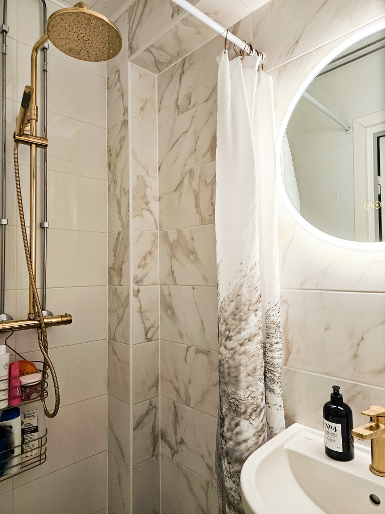 De guldfärgade detaljerna - kranen och takduschen - ger rummet en extra touch av exklusivitet.