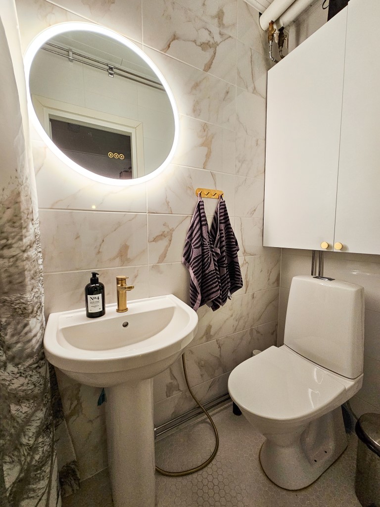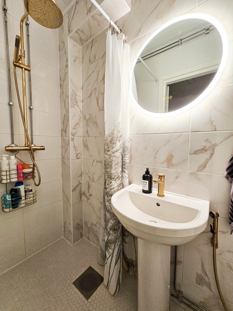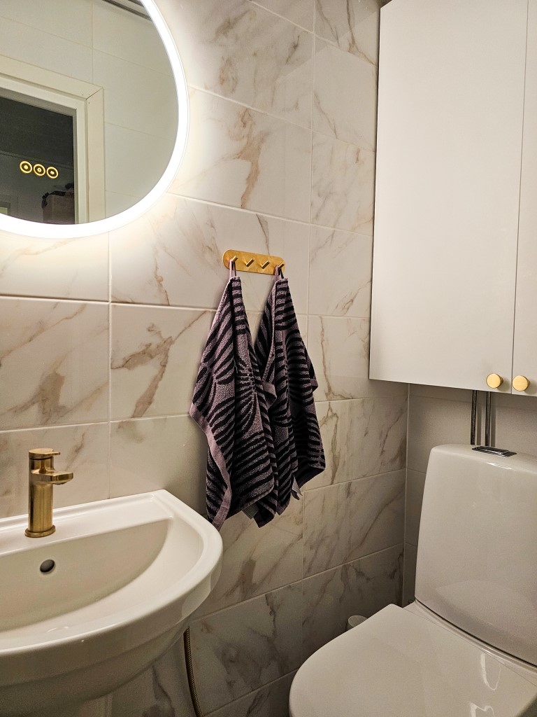 Materialvalen i det eleganta badrummet för tankarna till ett lyxigt hotell.