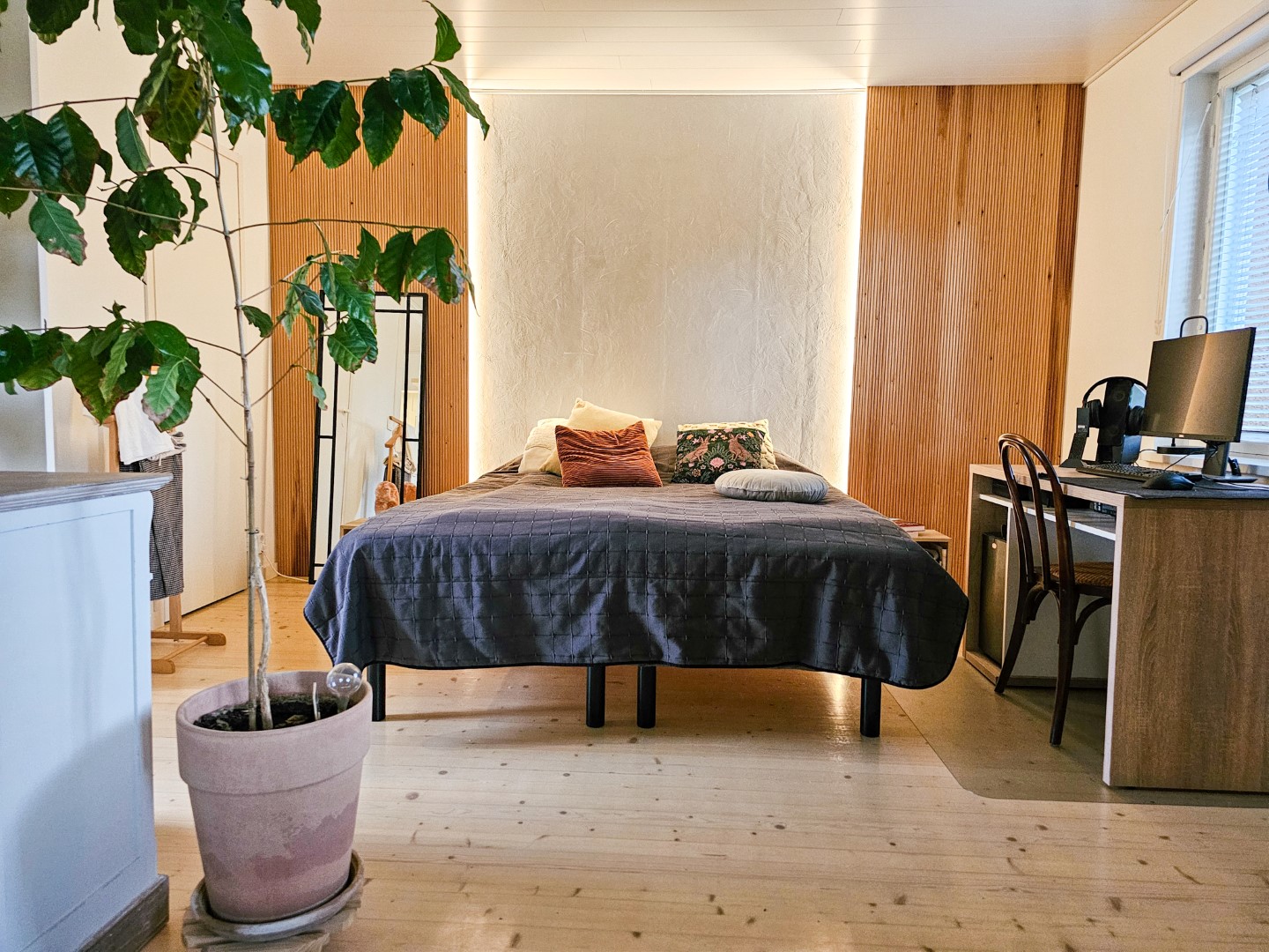 Olohuoneen ja makuuhuoneen väliset mustat lasiovet luovat kauniin katseenvangitsijan, ja makuuhuoneen sormipaneeliseinä taustavalolla tuo tilaan kontrastia ja mielenkiintoisen yksityiskohdan