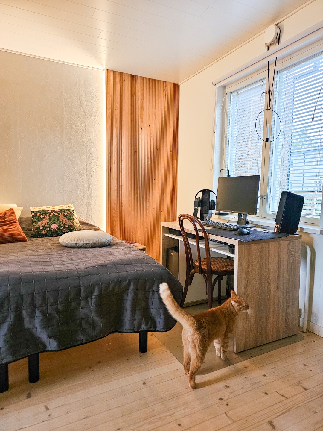 MAKUUHUONEEN KUVAUS: Puulattia, seinät maalattu/sormipaneeli. Vaatehuone.