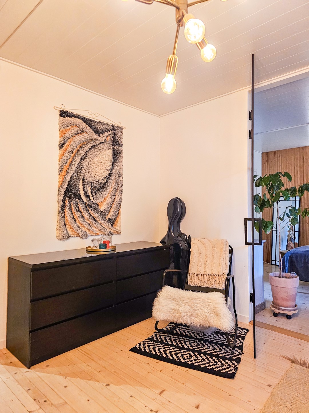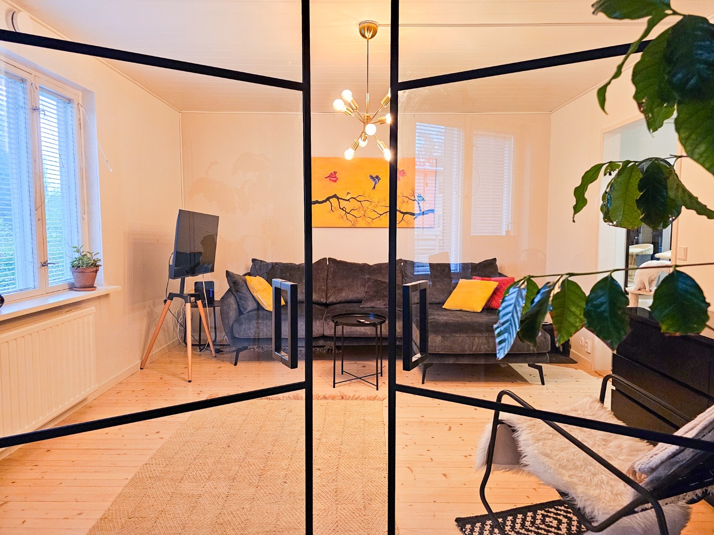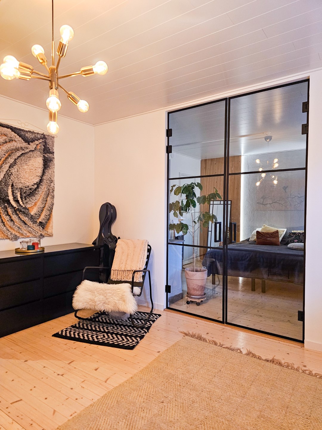 De svarta glasdörrarna mellan vardagsrum och sovrum skapar ett vackert blickfång, medan sovrummets vägg med fingerpanel och diskret belysning bakom ger en fin kontrast och blir en intressant detalj.