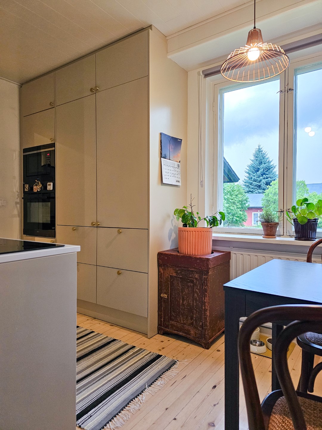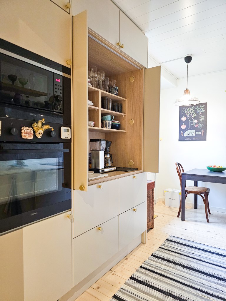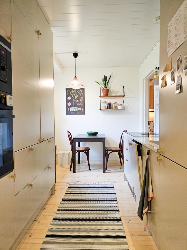 Köket till vänster i hallen är stilrent och modernt, med gott om förvaring - med bland annat ett praktiskt frukostskåp