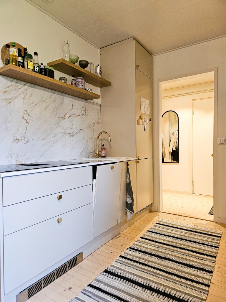 BESKRIVNING AV KÖK: Kök från Huusholli. Ingegrerad mikro, ugn, diskmaskin. Kylskåp-/frys, induktionshäll med inbyggd fläk. Trägolv, väggar målade.