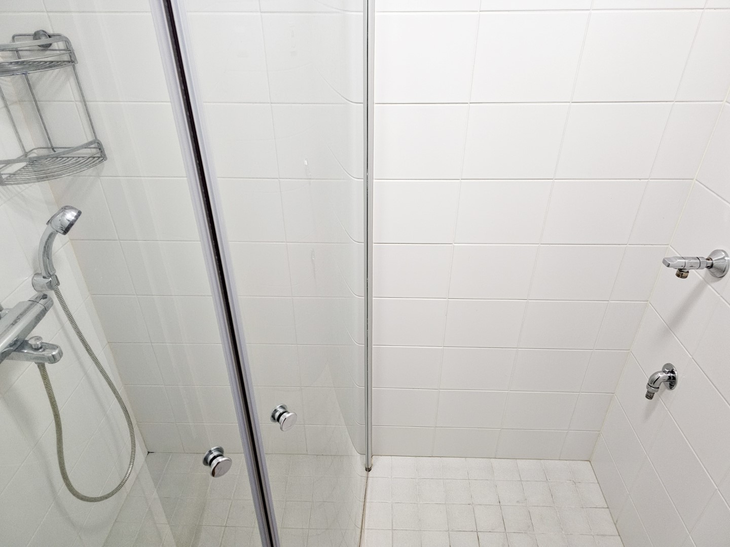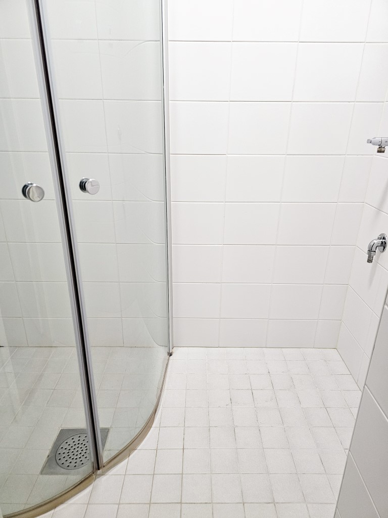 KYLPYHUONEEN KUVAUS: Suihkunurkka, pesukoneliitäntä. Lattia laatta, seinät kaakeli.