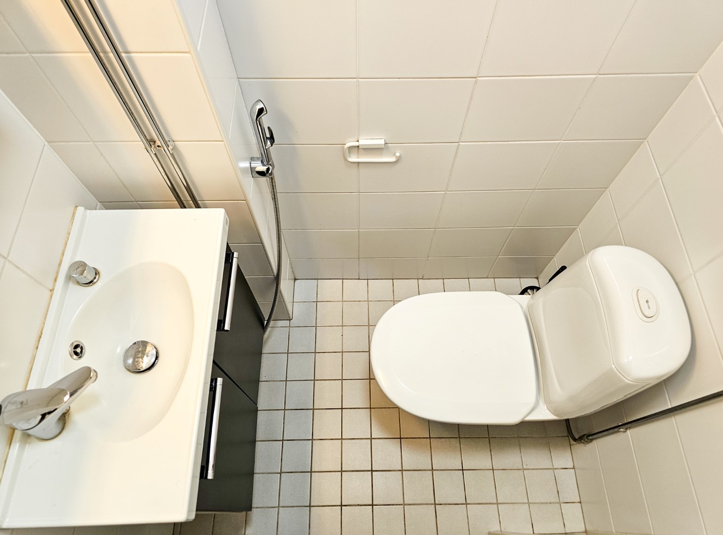 WC:N KUVAUS: Peili- ja allaskaappi, bidesuihku, wc. Lattia laatta, seinät kaakeli.