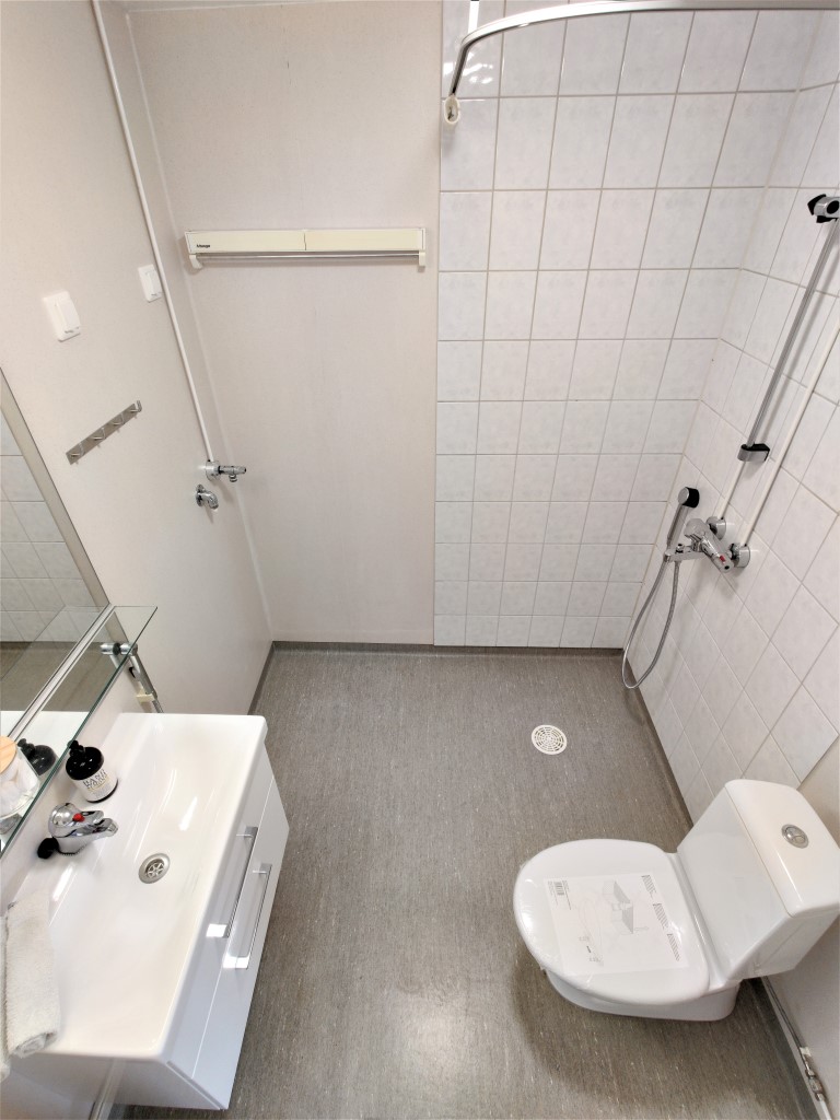 KYLPYHUONEEN KUVAUS: Peili, allaskaappi, wc, suihku, bidesuihku, pesukoneliitäntä. Märkätilatapetti, märkätilamatto.
