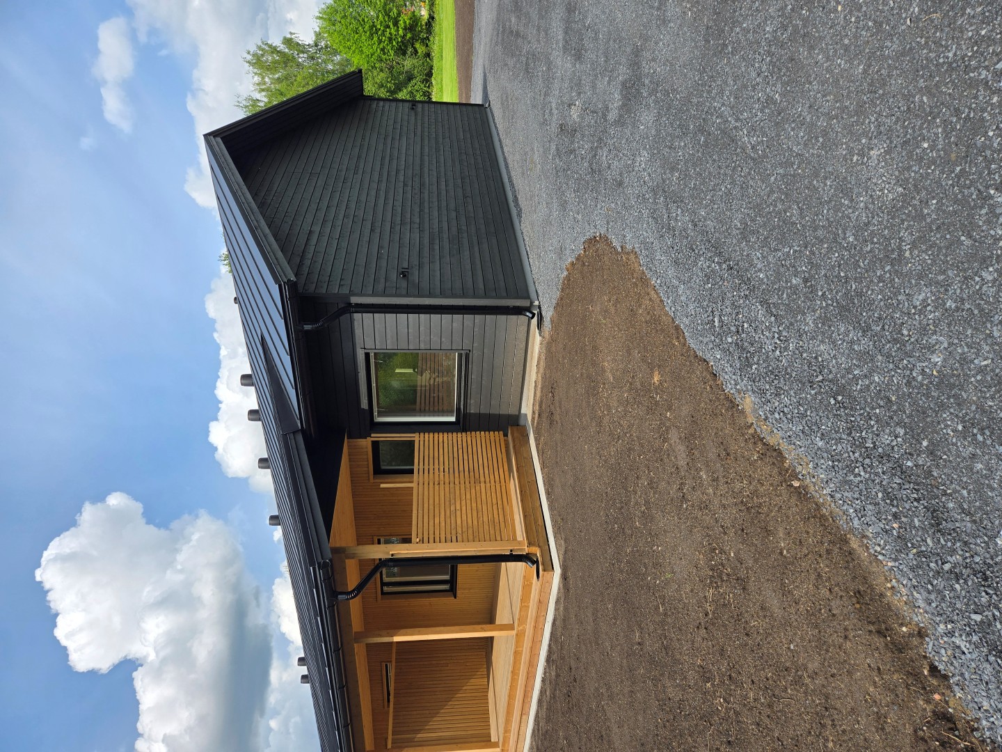Husets moderna mörka fasad med träinslag ger ett stilrent helhetsintryck.