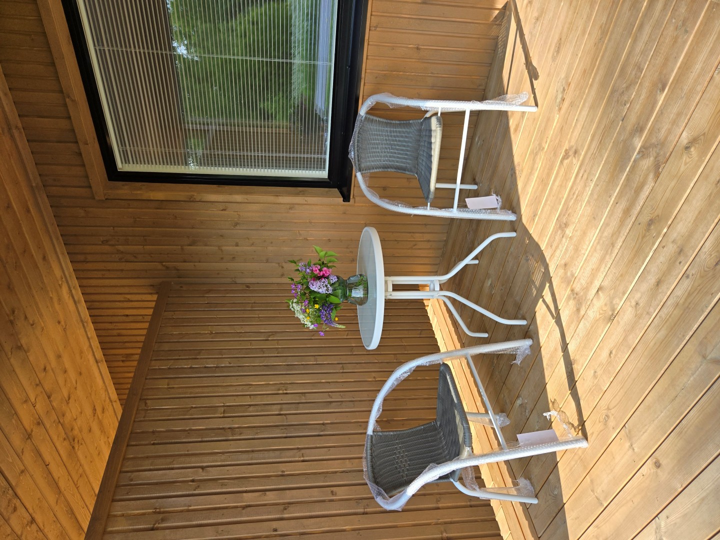 Från vardagsrummet kliver du ut till en stor, takförsedd terrass - perfekt för både morgonkaffet och trevliga kvällar. I anslutning till bostaden finns även ett praktiskt uteförråd.