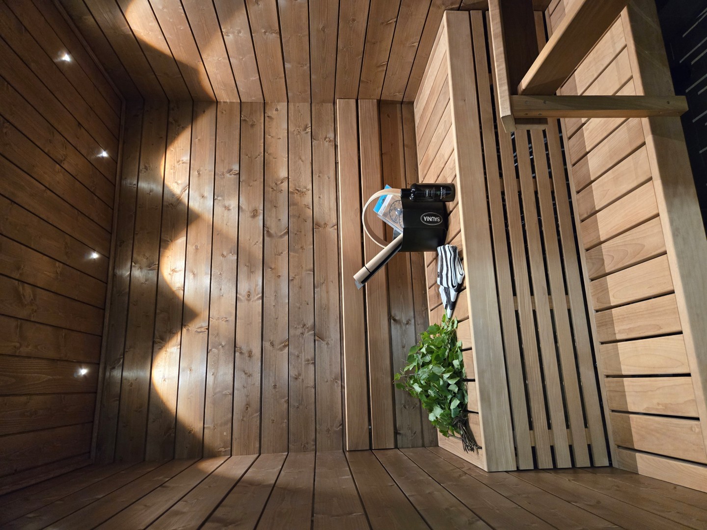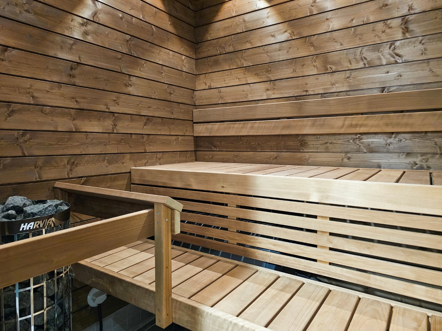 SAUNAN KUVAUS: Sähkökiuas. Lattia laatta, seinät saunapaneeli