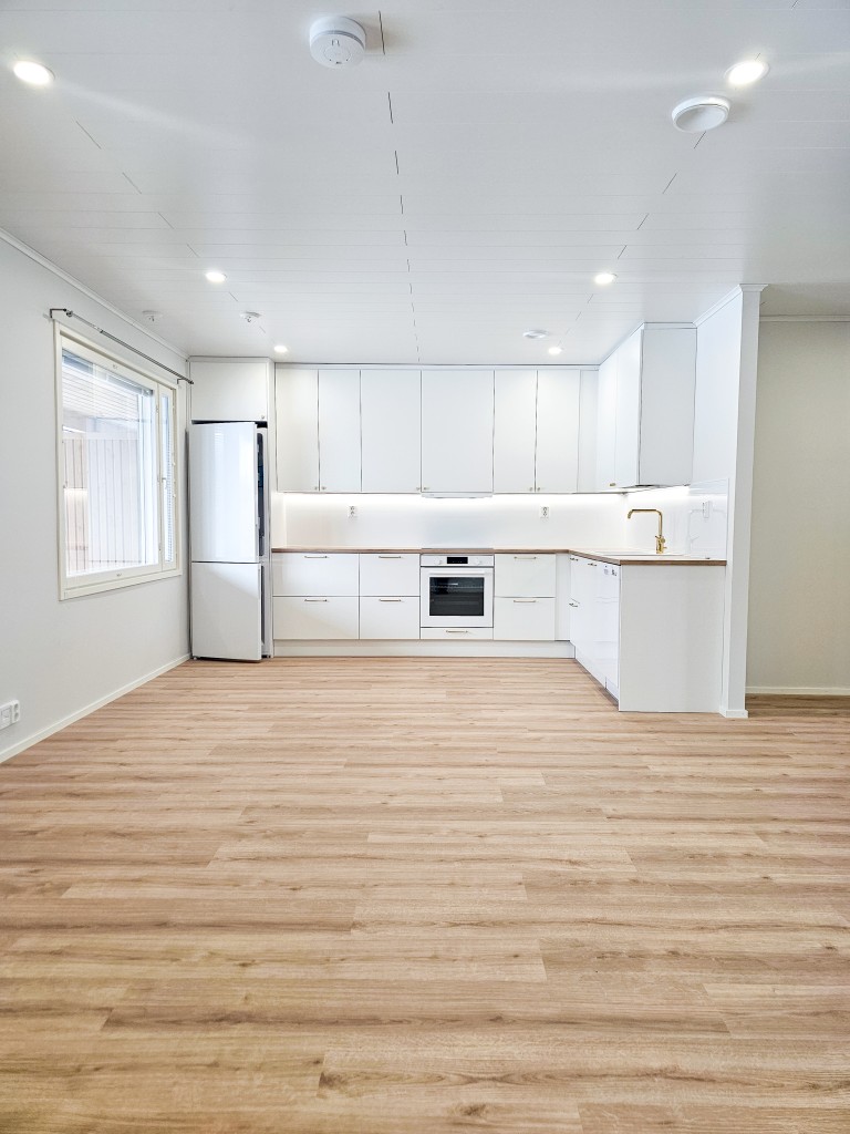 KEITTIÖN KUVAUS: Jääkaappi/pakastin, astianpesukone, induktioliesi, liesituuletin. Laminaattilattia, seinät maalattu