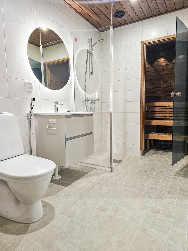 KYLPYHUONEEN KUVAUS: Suihku, peili, allaskaappi, wc, bidesuihku, kodinhoitonurkkaus jossa säilytyskaappeja ja pesukoneliitäntä