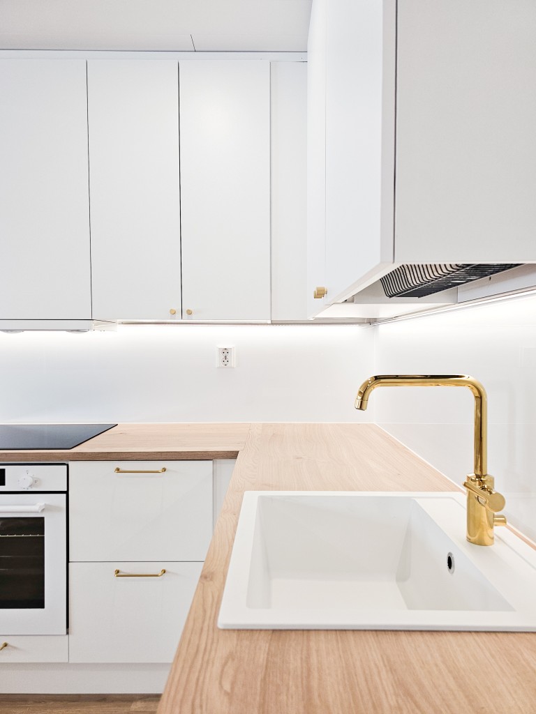 Bostaden på 65 m2 har en ljus och öppen planlösning mellan kök och vardagsrum, där det vita, fräscha köket med eleganta gulddetaljer sätter tonen. Ett rymligt sovrum, stort klädrum samt egen bastu och ett snyggt badrum med klädvårdshörna kompletterar helheten.