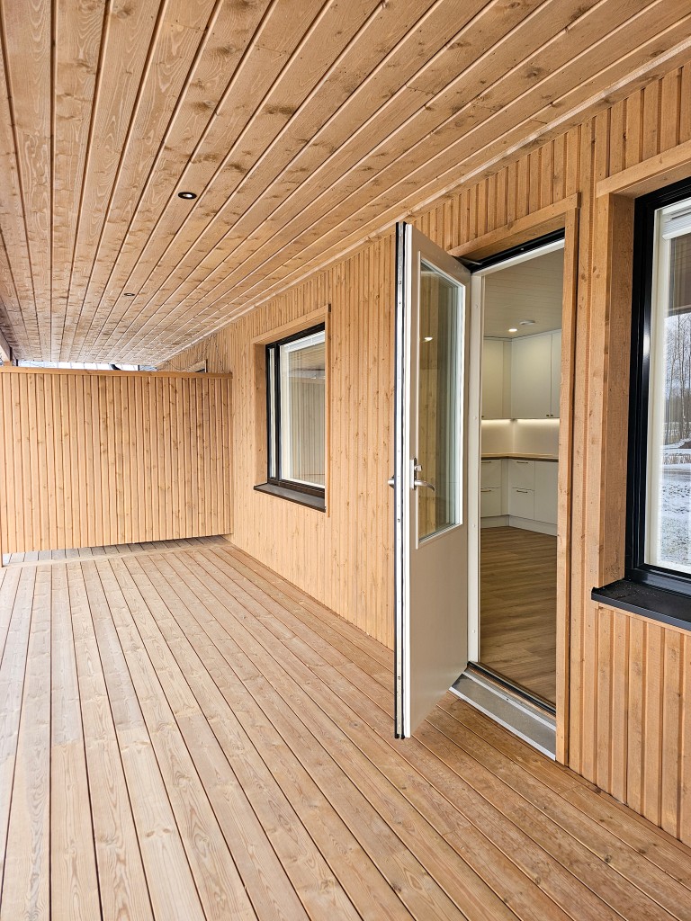 Olohuoneesta avautuu suuri katettu terassi - täydellinen paikka nauttia aamukahvista kuin illoista hyvässä seurassa. Asunnon yhteydessä on myös kätevä ulkovarasto.