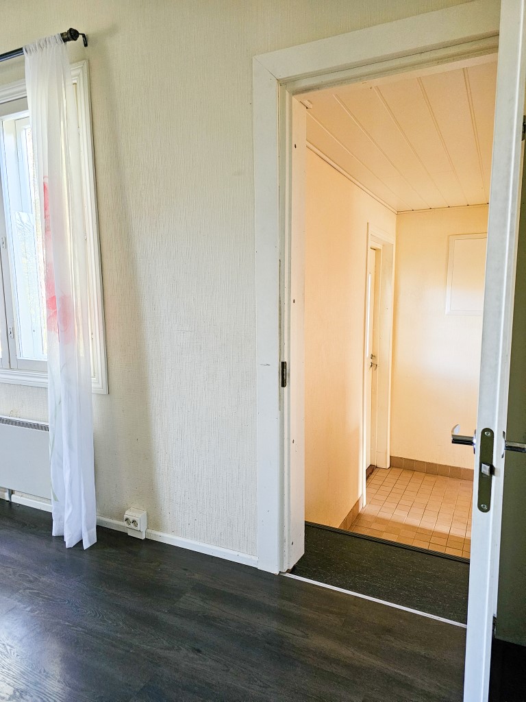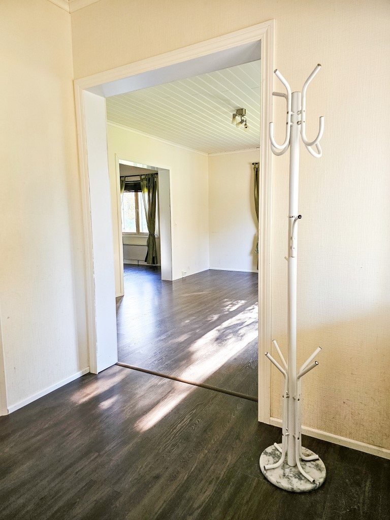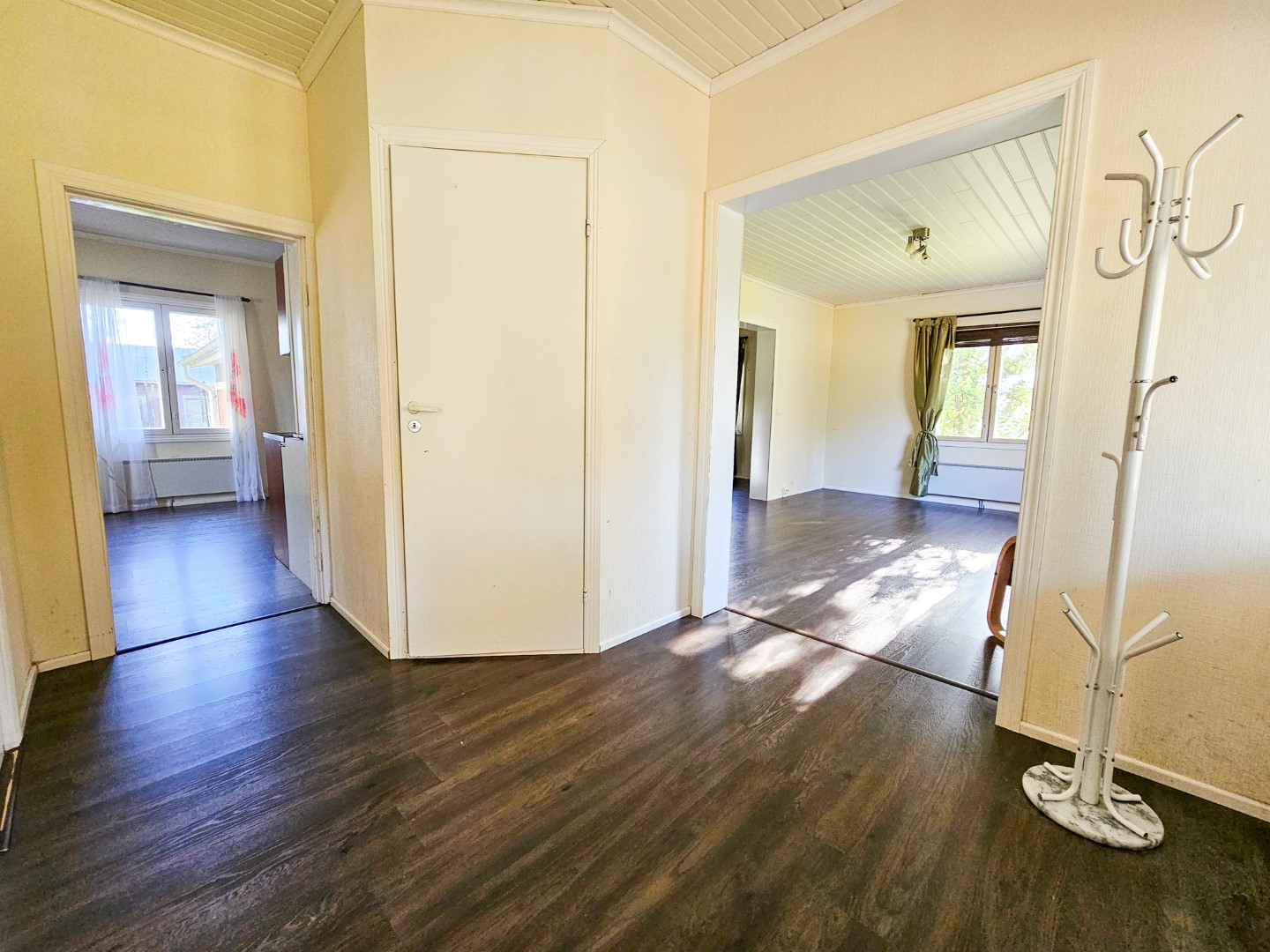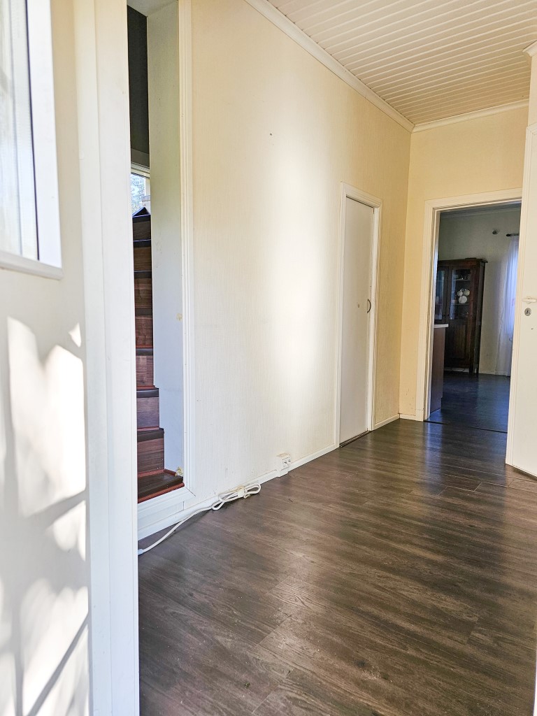 När du kliver in möts du av en öppen och välkomnande hall som genast ger en hemtrevlig känsla. Till höger ligger vardagsrummet, rakt fram köket och wc, och till vänster leder trappan upp till övervåningen med sina två sovrum. Den tidstypiska planlösningen med två rum och kök på nedre våningen är både praktisk och trivsam.