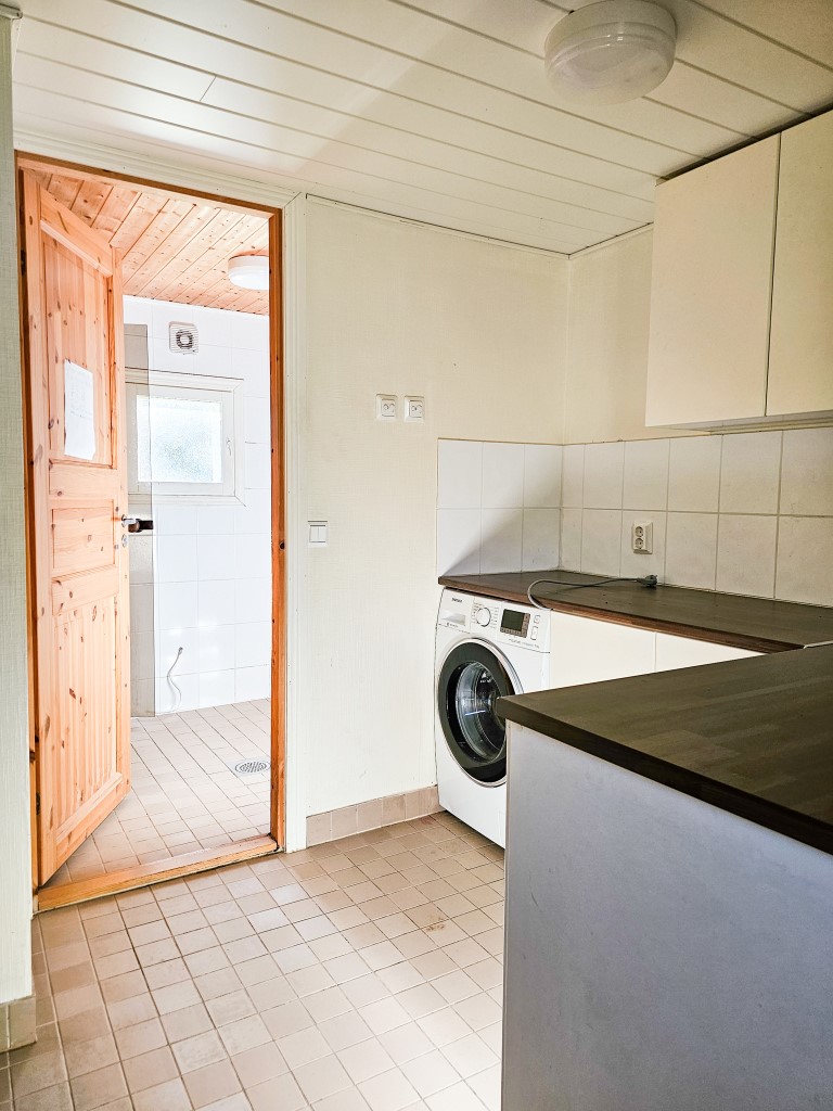 KODINHOITOHUONEEN KUVAUS: Pesukoneliitäntä, lämminvesivaraaja, kaappitilaa. Lattia laatta.