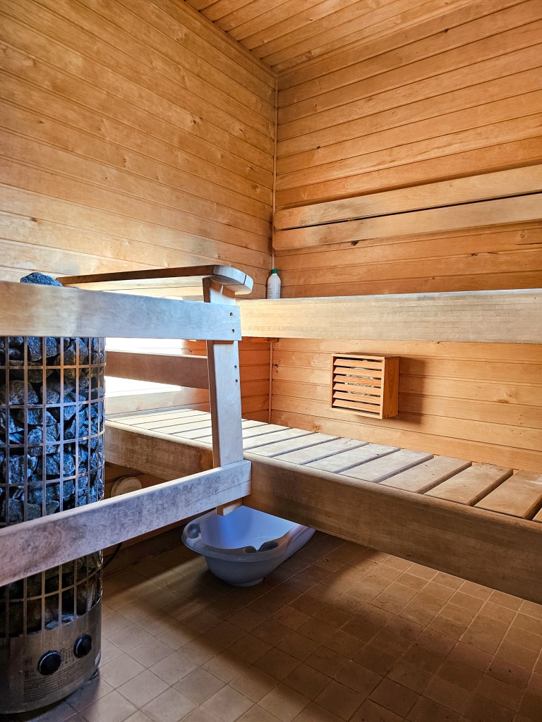 SAUNAN KUVAUS: Sähkökiuas. Lattia laatta, seinät saunapaneeli.