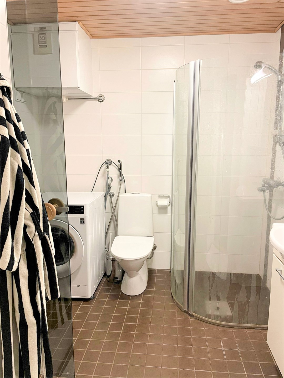KYLPYHUONEEN KUVAUS: Peili-/allaskaappi, suihku, suihkunurkka, pesukoneliitäntä, bidesuihku, wc. Lattialämmitys. Lattia laatta, seinät kaakeli.