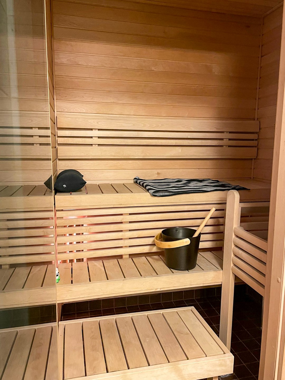 SAUNAN KUVAUS: Sähkökiuas. Lattia laatta, seinät paneeli.